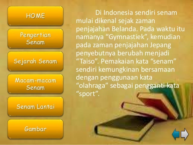 Posted : admin On 5/5/2019Sejarah senam lantai juga bisa kita lihat pada piramida yang ada di Mesir. Banyak piramida-piramdia Mesir yang menggambarkan dan menjelaskan tentang senam lantai. Piramida Mesir menceritakan suatu gerakan yang dulu dilakukan oleh para nenek moyang mereka. Pada tingkat sekolah atau yunior pertandingan dapat dibatasi pada nomor-nomor tertentu, biasanya senam lantai dan kuda-kuda lompat. Pertandingan tingkat Nasional dan Internasional bagi pria terdiri dari 6 (enam) nomor yakni: senam lantai, kuda-kuda lompat, kuda-kuda pelana, palang sejajar, palang tunggal, dan gelang-gelang. Senam lantai ( floor exercise) adalah satu bagian dari rumpun senam, sesuai dengandengan istilah Lantai,maka gerakan-gerakan senam yang dilakukan di atas yang beralasan matras atau permadani atau sering juga disebut dengan istilah latihan bebas,sebab padawaktu melakukan gerakan atau latihannya.